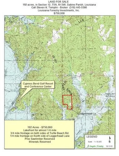 Enjoy Toledo Bend Reservoir with approximately ¼ mile frontage along the lake. This property has rolling topography and an excellent house place with 3-4 acres of cleared land. The property has approximately ¾ mile frontage on both sides of Turtle Beach Road, and ¼ mile frontage along the north side of Loggerhead Lane. Cypress Bend Golf Resort and Conference Center is two miles west “as the crow flies.”