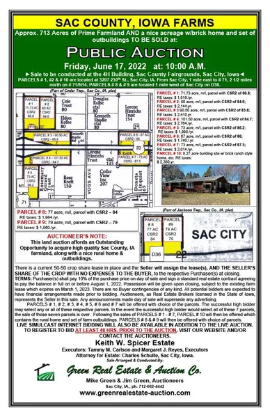 PARCELS # 1, #2 & # 10 are located at 3207 230th St., Sac City, IA. From Sac City, 1 mile east to # 71, 2 1/2 miles north on # 71/N14. PARCELS # 8 & # 9 are located 1 mile west of Sac City on D36.