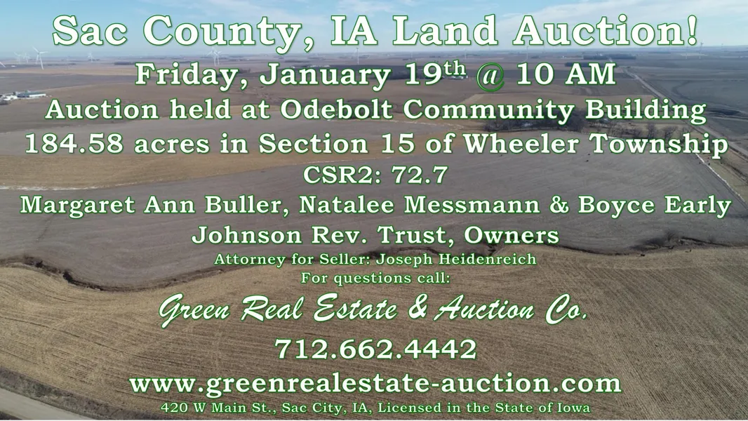 Selling a farm located South of Odebolt, IA in Section 15 of Wheeler Township, Sac County. Offered on the basis of 183.8,m/l, taxable acres and offered as one parcel.