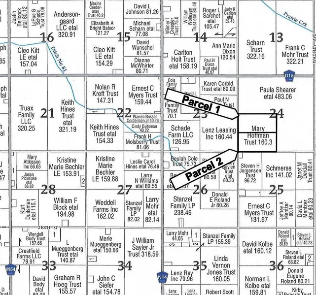 BRIEF LEGAL DESCRIPTIONS FARM 1: N1/2 SW1/4, Section 24, T89N, R35W 5th P. M., Sac County; FARM2 : S1/2 SW1/4, Section 24, T89N, R35W 5th P. M., Sac County, Iowa. (Douglas Township) GENERAL DESCRIPTION & METHOD OF SALE 156 Net taxable acres of highly productive, well located Sac County, Iowa farmland: FARM 1: North 79 net taxable acres with a CSR2 on tillable acres of 86.1 Sales price will be high bid times 79. Farm 1 has approximately 54.84 tillable acres 19.3 currently enrolled in CRP program paying $300/acre. Farm 1 also 5 acres enrolled in a Prairie Pothole program with the Sac County NRCS office that is paying $381.55/Acre and expires on December 31, 2027. FARM 2: A 77 net taxable acres w/ CSR2 on tillable acres of 87.2. Sales price will be high bid times 77. Farm 2 has approximately 66.74 tillable acres and 10.5 acres enrolled in CRP program paying $300/acre. CRP contract on...