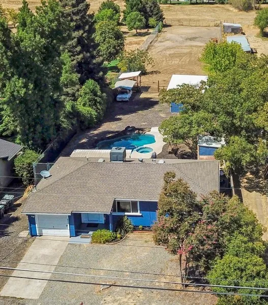 Cute renovated country cottage that's got room for you, your horses, and your toys! You will love the spacious open layout, wood floors, formal dining room and updated kitchen with granite counters and stainless appliances. Large bedrooms, and remodeled bathrooms. Composition roof, dual pane windows, and newer HVAC. Situated on nearly three quarters of an acre, the property is an outdoor oasis. Enjoy hot days around the built-in swimming pool and spa! HUGE metal detached 35'x24 garage is perfect for storage or for your projects. Covered 12x20 carport space. Lots of space for a garden or to play. Your 4-legged babies will have a 10'x12' horse stall and have lots of pasture space to wander. Separate storage shed and chicken coop. All this and a commutable distance to the city! Don't wait!