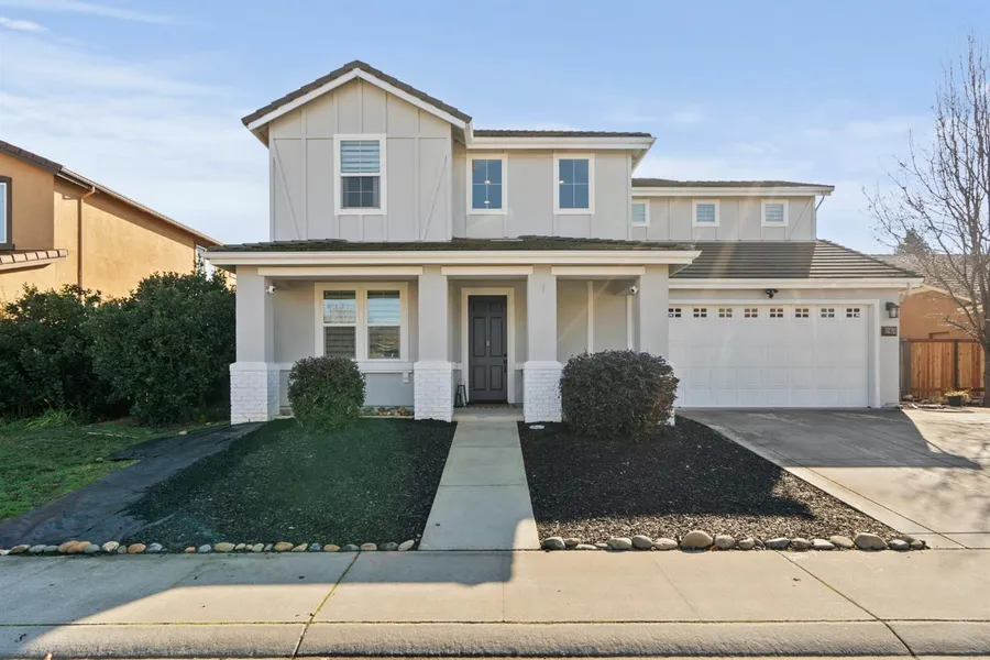 This stunning home in Kavala Ranch offers the perfect blend of location, space, upgrades, and unbeatable value! The solar-powered Lennar Merlot floor plan features an open layout, starting with a cozy downstairs area with oversized tile flooring and a den with Dutch doors, which could be a potential 5th bedroom. A double-sided fireplace separates the formal dining and living areas. The spacious kitchen includes stainless steel appliances, double ovens, a gas cooktop, a built-in microwave, granite countertops, a large island with a sink, and a walk-in pantry, all flowing into the family room and breakfast nook. Upstairs, enjoy four large bedrooms, including a master suite with a walk-in shower, sunken tub, double sinks, and a walk-in closet. The convenient upstairs laundry room includes a sink. The spacious backyard features a concrete patio in the back and side yard, and a covered patio, ideal for outdoor living. With a 3-car tandem garage and proximity to shopping, bike trails, and a neighborhood park, this home is a must-see in the award-winning EGUSD. No HOA with a rare VA assumable loan at just 2.25%!