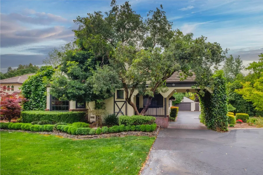 Welcome to a Sierra Oaks Vista urban farm oasis! Nestled on nearly an acre, this unique estate blends the charm of country living w/the convenience of a central location. At its heart is a beautifully preserved 1950s Tudor-style home full of character & warmth. The inviting front yard has grand circular driveway, ample parking & a stately porte-cochere entry. Step out back to an entertainer's dream: a spacious deck, outdoor kitchen & a newly remodeled pool complete with an oversized spa and Cabo shelf. Past the pool, enjoy a custom Bocce ball court w/ a steel scoring station and lighting for evening games. Sharpen your short game on the 6-hole putting green with three chipping areas and a driving cage. The rear of the property reveals a full-fledged farmstead. Highlights include a bespoke She-Shed crafted with reclaimed wood and artisan tile, equipped with A/C, a sink, and beverage fridge. You'll also find a hen house and chicken run, a picturesque greenhouse, live-roof tool shed, tiered fountain, and multiple raised garden bedsall tucked behind a handcrafted redwood gate. Rounding out the property are two detached garages: the original with an EV charger, and a newer three-car garage with generous shop space all just a 5-minute walk to Loehmann's Plaza and Temple Coffee