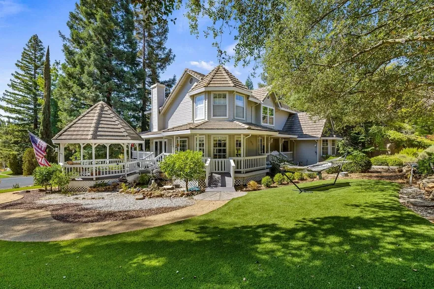 Escape to Rancho Murieta, the perfect place to call home! This Victorian inspired dream home sits on a spacious, tree-lined corner lot providing natural beauty, shade and privacy. The expansive wrap around porch offers room to relax on a porch swing while taking in the lovely view of the colorful landscape. Inviting, two-story foyer welcomes you to the thoughtfully designed lower level, starting with engineered wood floors, a coffee/wine bar and an energy efficient electric fireplace to gather around with family and friends. Enjoy the centrally located kitchen with stainless steel appliances, walk-in pantry and dining nook with bay windows. A large bedroom is adjacent to a full bath and has an exterior door making it easy to convert into a separate living area. The upper level includes an additional large bedroom with attached full bath and the primary suite featuring a delightful balcony for morning sunshine, gorgeous wood burning fireplace, walk-in closet and large ensuite with luxurious soaking tub. With miles of trails, lakes and rivers to explore, you will appreciate the 3-car garage to store kayaks, paddleboards and Ebikes! The golf cart garage could also be an office or art studio. This beloved community has so much to offer; come by for a visit and fall in love!