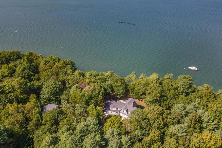 Well built Shingle Style home on the shores of the New Meadows River. 12.4 acres with over 500 feet of deep water and a dock. 4 bedrooms, 3 baths, office plus wood burning fireplace in the living room and an elevator.. Spacious decks and screen porch. Includes 2 bedroom, kitchen and bath Guest House and a two car garage. Located between Bath and Brunswick. Easy highway access.