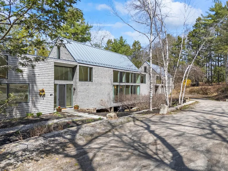Set on 4 acres along the salty shores of Mill Cove, this Carol A Wilson designed contemporary quietly rises from the forest floor with an indigenous sensitivity. Clad in weathered shingles, this elegant design compliments its setting while providing an exceptionally functional floor plan. Tall, south-facing walls of glass celebrate the gardens, the change of seasons and the wooded glen setting. The views of the ever-changing tidal waters are framed with a band of north-facing windows. The two story glass entrance foyer draws the eye right through the house to the water's edge. Convivial open living space encourages gathering in the kitchen, settling down to a holiday meal in the dining area and still allows plenty of room to watch the Big Game in the living room. The first floor also offers double studies/offices with floor to ceiling bookcases as well as two ensuite bedrooms on the first floor. Upstairs are additional bedrooms, as well as a primary/guest suite with full private bath. In addition to the attached 2 car garage, there is a custom post and beam 3 car garage including a second floor space - ideal for finishing as a studio, woodworking space or additional storage.Architect Carol A. Wilson's values as a world citizen and Maine resident come through this exceptional execution of simplicity. The home reflects that people matter, their daily habits matter, the environment matters, materials and sustainability matter, simplicity and integrity matter. In a world full of excess, this home offers a respite from the chaos, restores the soul and heals the heart. Call for your private showing today.