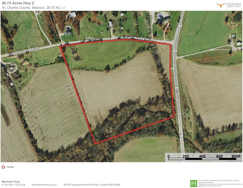 29+/- Acres at the corner of Hwy Z & South Point Prairie. Tremendous potential for commercial development or large residential lots. Public water on site, blacktop frontage on two sides, and bordered on the south by Dardenne Creek. Nice mix of woods and open ground. This property will not last!