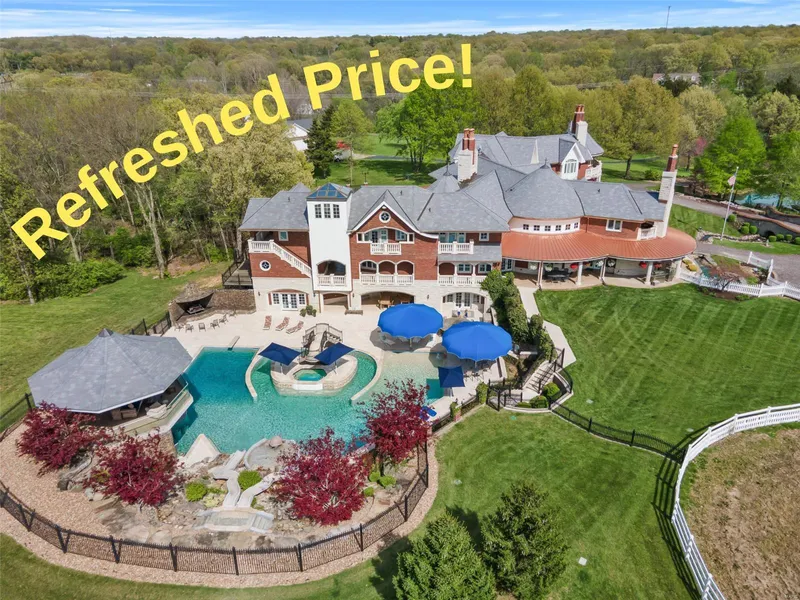 Newly refreshed price! This one of a kind English Country Estate feels worlds away but is in easy proximity to St. Louis Lambert International Airport and Spirit of St. Louis Business Aviation Center. Embrace over 20,000 sq. ft. of "Luxury Meant to be Lived In" built to suit multigenerational families with room for all. The 40+ acres (up to 130 available) include stables, sports field, playground, Ferris wheel, event/sports venue, raised bed gardens, & a resort worthy pool with racing slides, swim up bar, lazy river, waterfall covered grotto, dive board, and zero edge entry. The warm interior boast radius moldings, 8 masonry fireplaces, private chapel, 2 primary suites, 2-story study/library, and the exterior is full masonry. The lower level is unbelievable with bowling lanes, expansive bar, theatre, dance floor, conference room, dual changing rooms/showers for pool, and unending fun! Fi...