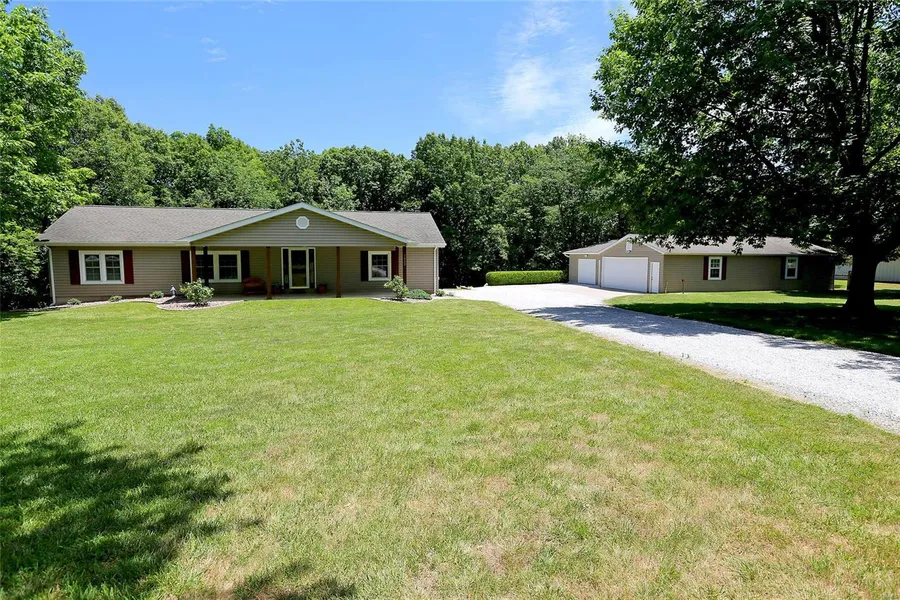 Sitting on 5+/- acres, this split ranch home backing to woods has much to offer. Wood floors throughout the main living area; carpeting cushions your feet in the 3 bdrms. Open floor plan & vaulted ceilings on main level add a spacious feeling. Primary bdrm ensuite has updated shower, dbl vanity, linen closet, a 11'x5'walk-in closet accessed from the bdrm & the bathroom. Granite countertop, breakfast bar, stainless appliances, custom cabinets with roll out shelving & pantry are hi-lites of the kitchen. Dbl doors lead out from the dining area to a 30' x 12' covered deck w/recessed lights & stairs to the 30'x 10' covered concrete patio. LL level has a den, summer kitchen (no sink), large F/R with doors to patio & huge storage area. Main flr laundry. 2 outbuildings are insulated & drywalled, have concrete floors and electric. Bldg 1 is 50'x24' w/overhead garage door currently used as detached garage, bldg 2 attached to the garage is a 31'x20' workshop w/overhead door to metal leanto.