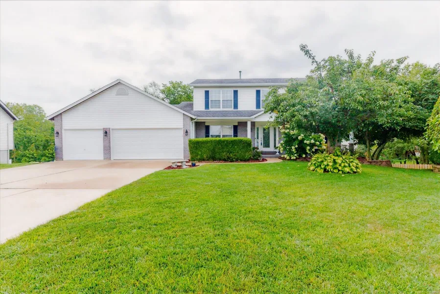 Stunning 2-story home on a quiet cul-de-sac with exceptional curb appeal, new gutters, and a new roof coming soon. The backyard is an oasis with a pergola, pavers, elevated planting beds, solar lights, and a serene pond with a waterfall. The main floor features a freshly repainted interior, a cozy living room with a woodburning fireplace, sitting room, front office and a gourmet kitchen with 42" soft close cabinets, granite countertops, tile backsplash, wine fridge and a huge center island. The adjacent laundry room includes a barn door and is conveniently located off the garage. Upstairs, the primary suite offers vaulted, beamed ceilings, a remodeled ensuite bathroom with a tub and chandelier, large tiled shower, and granite vanities. Three additional bedrooms have laminate flooring and ceiling fans. The finished basement includes a rec. room with wet bar, an extra bedroom, and a bath with a shower/tub combo. The 3 car OVERSIZE garage and ample storage complete this versatile home.