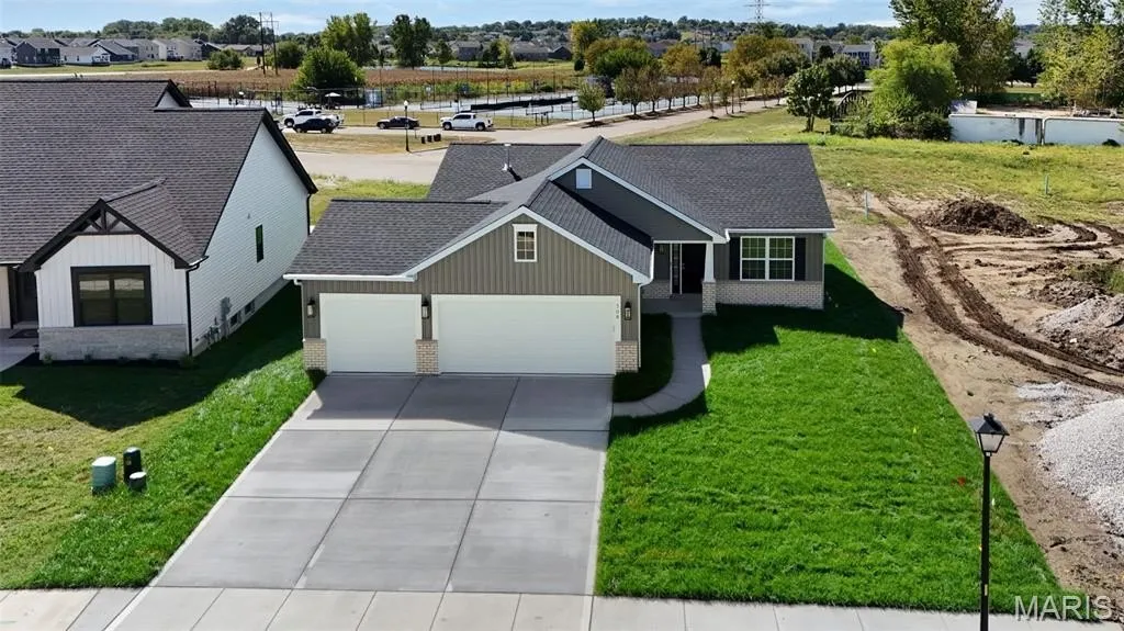 This Ranch Style Home has a 3 Car Garage, Vaulted Ceilings in the Great Room, Kitchen & Dining area. The Kitchen has White, Soft Close Cabinets & Drawers, Quartz Countertops, a 9" Deep Undermount Stainless Kitchen Sink w/ Pull Down Moen Faucet, an Island with Overhang, Stainless Appliances, Recessed Lighting & Laminate Floors which flow into the Great Room & Dining area. The Primary Bath has a 5' Shower w/ Seat & Semi Frameless Shower Door, Double Bowl, Adult Hght. White Vanities, Wave Bowls & Moen Faucets. Other Features in this Home Include 2 Panel Doors w/ Levers, 5 1/4" Baseboards, Custom Paint, Garage Door Opener w/ Keypad, Egress Window, Rough in for a Future Bath in LL, a 16' x 14' Concrete Patio & a Fully Sodded Yard.