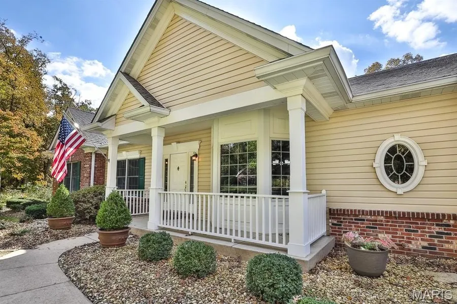 Meticulously Maintained Atrium Ranch Nestled in a Picturesque setting on 3 acres in Wentzville Schools! Formal dining features tray ceiling, 3-bay window, and crown molding. Vaulted great room boasts gas fireplace w/decorative wood mantle. Lovely den- perfect for watching tv or office space. Breakkfst area offers 2 sets of French doors! 1 leads to a stunning 3 season room & 1 opens to an expansive deck overlooking the backyard & wooded area beyond. 42” cabinets adorn the large kitchen w/pantry, Double ovens & Trash Compactor! MF laundry w/utility sink + space for extra freezers/mudroom setup! Vaulted Master Ste w/luxury bath boasts dbl sinks & corner soaking tub. 2 addl bdrms, full hall bath & powder rm complete the main floor. Finished walkout LL has expansive rec/family area w/fireplace, kitchenette w/brkfst bar, 4th bdrm, & office (5th bdrm) w/doors to patio. Attached 3-car garage w/stair access to LL workshop! PLUS Extra Detached 4-Car garage- a Car Lover's Dream!! Enjoy the convenience of an in-ground irrigation system.