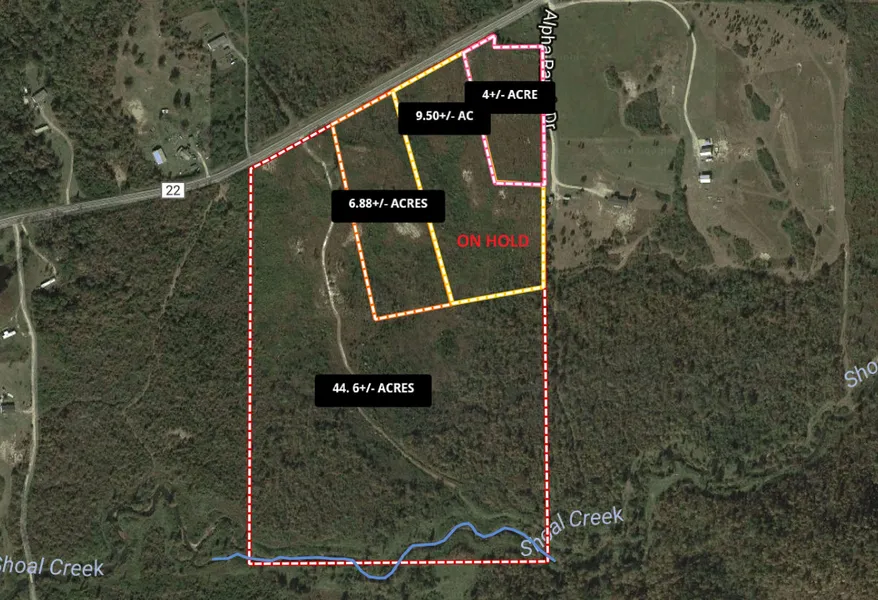 Come Homestead the Valley in Shoal Creek in Ashville, AL. Several Tracts to Choose or Buy all. 4+/- Ac. 6.88+/-, 9.5+/- on Hold, or 44+/- Acre. All tracts will have road frontage with Water and Power at the Road. 44+/- Acres or if Purchased all, you would have nearly 1,000 feet on Shoal Creek. Opportunity for Additional Green Fields to Hunt Turkey and Deer. Lays great to fence for Cattle or Horses. Some restrictions will apply.