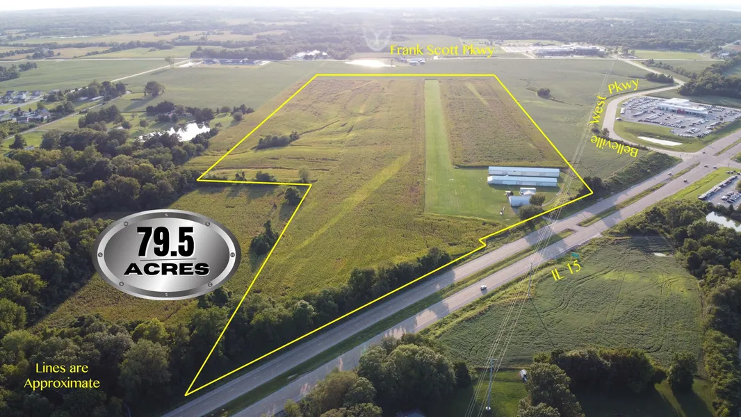 79.5 acres of mostly tillable land with a soil productivity of 124. Located just east of the intersection of Belleville West Parkway and Route 15 with access from both roads. Zoned C2 (heavy commercial). Property does have an air strip down the middle. About a half mile away from Belleville Crossing Shopping Center with Home Depot and Target. Car dealerships occupy two corners of that intersection. Electricity is on the property. Per IDOT, daily traffic count is 25,400.