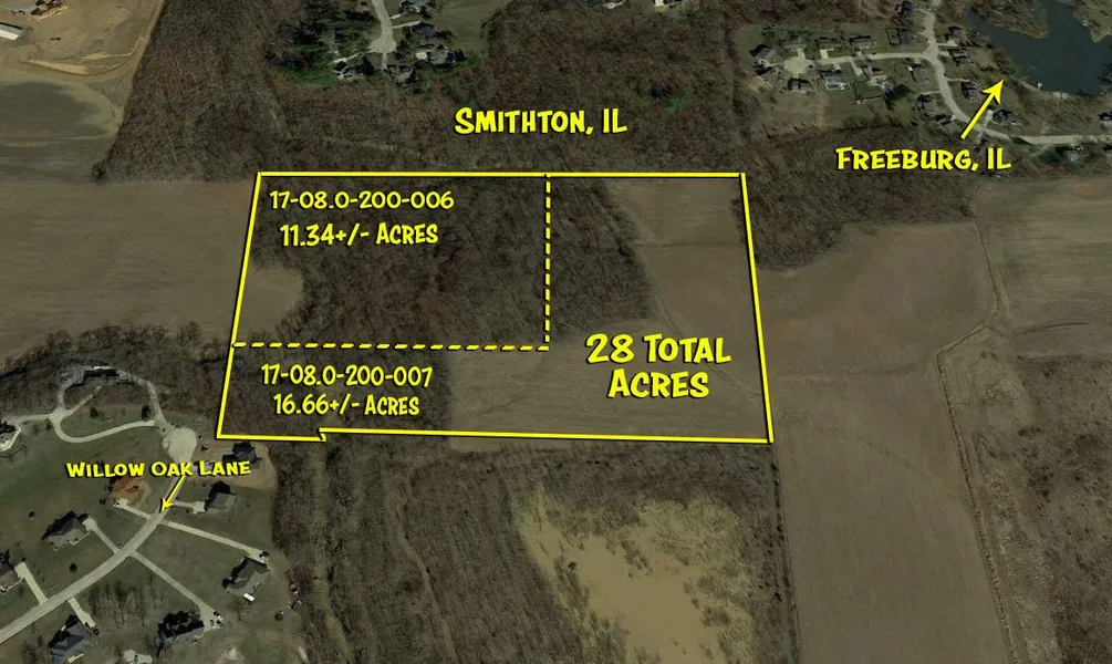 Whether you're looking for income producing farm land, recreational ground or a building site for your dream home, look no further, this property has it all. These two separate, but joining tracts total 28+/- acres and offer terrific opportunities for potential building sites. The estimated tillable acreage is 10.1+/- acres and the remaining acreage is comprised of timber with additional income potential from possible timber harvesting. The acreage is situated within Village of Smithton zoning jurisdiction, it is the responsibility of the buyer to verify rules and restrictions of any structure to be built.