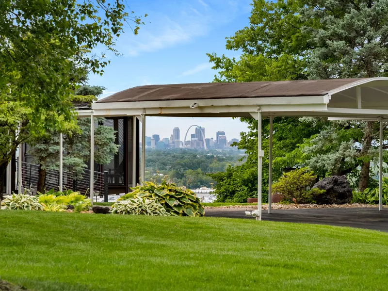 This secluded bluff property is the signature project of notable architect, Charles E. King and is recognized as one of the outstanding examples of Mid-century Modern residential design in the midwest. With spectacular views of the St. Louis skyline, the property attracted the attention of famed architect Frank Lloyd Wright who designed and originally began construction before the project was finished by King to use as his primary residence. Floor-to-ceiling windows and multiple outdoor spaces define the King house including a floating gazebo and bluff side pool with unmatched sunset views. 4 bedrooms, each with ensuite bathrooms, and a unique open floor plan with multiple levels and a floating living room complete the 7000+ square foot luxury compound. A pole barn and 55+/- acres with a mix of pasture and woods give opportunity for those wanting space for additional buildings, horses, hunting, or private development.
