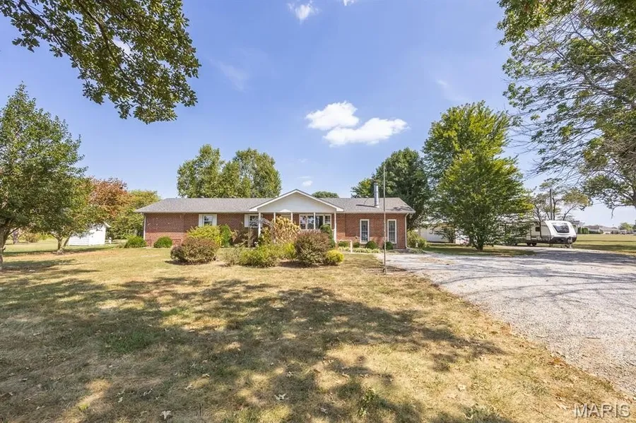 A Rare Opportunity Just Outside Mascoutah! Nestled on over 2.6 acres, this charming all-brick home offers a perfect blend of space, comfort, and functionality. Positioned prominently on a beautifully landscaped lot, the home features a bright and inviting living room with large windows overlooking the covered front porch and yard. The spacious eat-in kitchen includes ample cabinetry and offers scenic views of the expansive backyard—ideal for both everyday living and entertaining. Convenient main floor laundry and an updated full bath with a relaxing Jacuzzi tub add to the home's appeal. The second bedroom includes two closets—one of which is a generously sized walk-in, perfect for storage of seasonal wardrobes. The primary suite features built-in shelving, a large walk-in closet, and a tub/shower combination. An addition of the huge great room with the gas fireplace makes gatherings a breeze. Step out to the bright sunroom and relax with your morning coffee while watching the birds. A standout feature of the property is the 24' x 50' detached outbuilding—ideal for hobbyists, a workshop, or additional storage. Multiple established garden areas await your personal touch. Don’t miss this unique chance to enjoy country living with close proximity to Mascoutah’s amenities.
