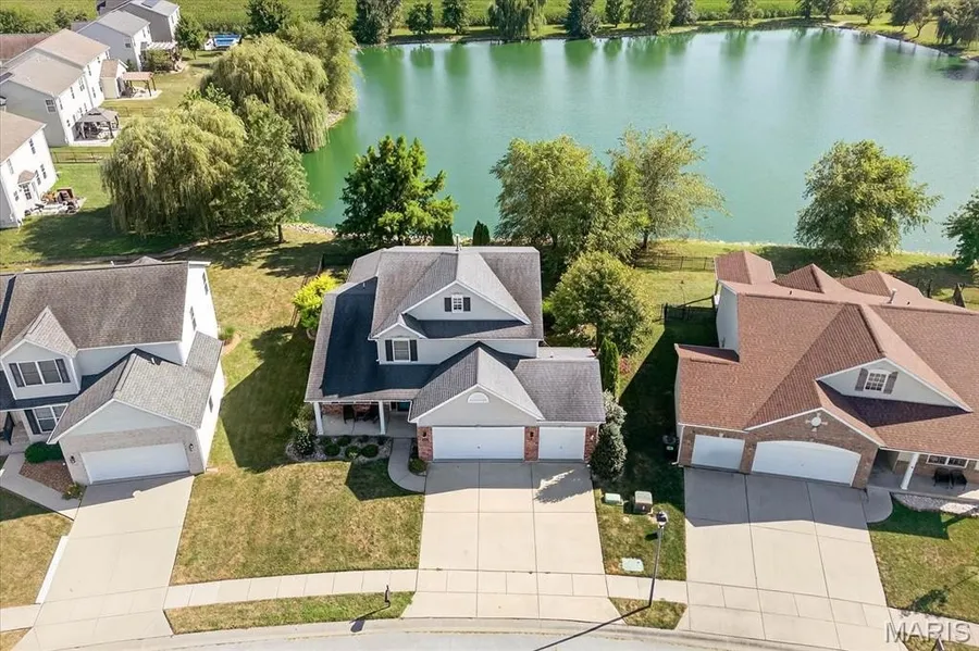 What more can you ask for? Waterfront lot, fenced yard, primary bedroom on the first floor, finished basement, 3 car garage and all in Mascoutah school district! Inside the two story foyer entry you'll find hardwood floors, living room with gas fireplace that opens to the beautiful kitchen with breakfast bar, eat in area, granite counters, and all appliances to stay and just off the formal dining room. The primary bedroom on the main floor makes this a forever home possibility without ever having to take the steps! The primary bath also has a separate soaking tub and shower with a walk in closet. The main floor also offers a convenient half bath and a larger laundry room that leads to the 3 car garage. Upstairs there is a loft area, three more bedrooms that share a full bath. The finished basement has a built in desk system great for crafts or work from home. The projector and screen stay in place for your movie nights! Lots of unfinished space for storage and potential to finish a bathroom. Enjoy the waterfront view from the covered patio out back, another patio that would be great for a hot tub, and all fenced in! So many extras like year round lighting on the front of the home and new carpet in the basement! Minutes to Scott Air Force Base and Mascoutah schools! Audio and visual on the property.