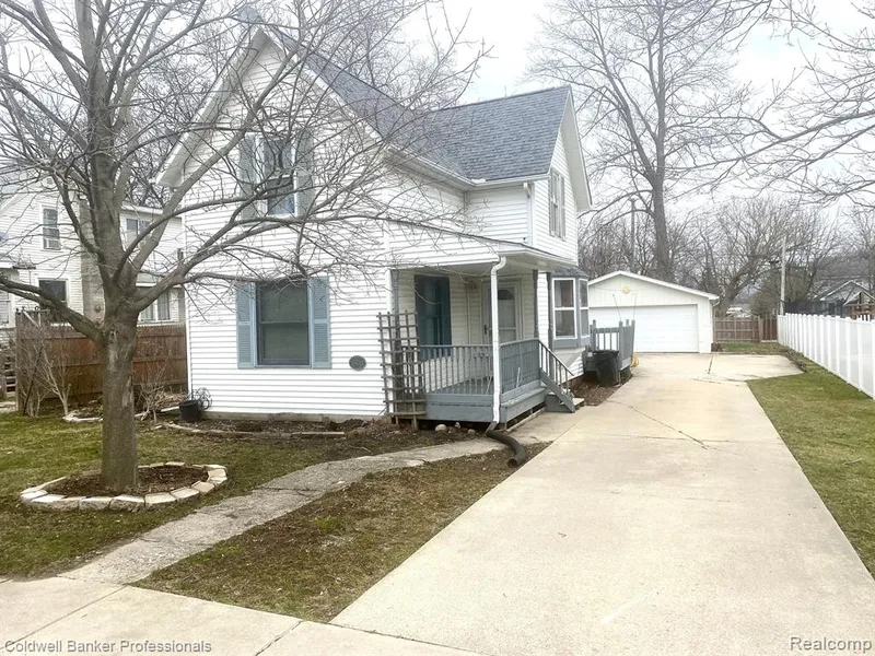 Relaxing covered front porch leads you inside this Historical Capac home! Now discover an easy flowing floor plan with first floor bedroom, full bath, flex room, living room, bay window and laundry. Next is a Bright Kitchen with plenty of cabinets, counterspace and a doorwall leading to the deck. Upstairs you'll find 2 spacious bedrooms, half bath and an open area perfect for office or play. Plenty of room in the back yard with playset included. 3 car garage feels more like a pole barn and driveway has lots of parking space! Walking distance to shopping. Great value, tons of potential!