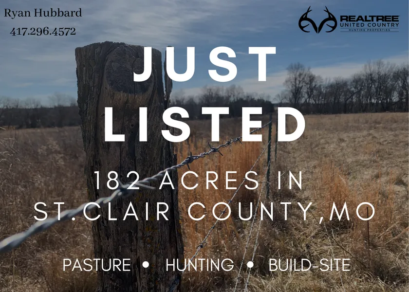 Pasture has become hard to find in the last 3 years, but today we are listing a 182 acre farm located about 10 miles east of Osceola, MO in St Clair County. This farm boasts ~140 acres of pastureland with the balance in a perfect wooded setting for deer and turkey hunting. The farm is composed of 155 acres on the north side of Hwy 82, and the old home place and 27 acres are on the southside of the highway. The southern 27 acres includes a 40x60 pole barn, cattle waterer, drilled well, and electricity with some of the boundary fence being 6-strand barbed wire. The north side of the highway has 6 total entrances with road on 3 sides. It has a large pole barn in the SW corner that is surrounded by stunning walnut trees. There are 2 ponds and a waterer on the north side. Cross fencing is in place as well.