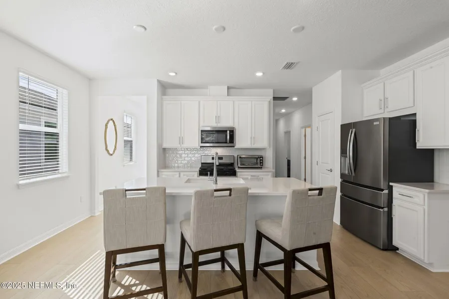 Welcome to this beautiful 4 bedroom 2 bath home offering modern finishes & a serene preserve backdrop. The kitchen features quartz countertops, soft close doors & drawers, a Blanco sink, stainless appliances, gas stove & a spacious island that opens to the living area filled with lots of natural light. The main living spaces feature LVP flooring & a floor outlet for added convenience. The master suite includes a walk in closet & a spa inspired bath with a walk in shower, frameless enclosure & bench seating. A split floorplan provides privacy with 3 guest bedrooms & a guest bath located away from the master suite. Additional features include natural gas, a tankless gas water heater, garage epoxy flooring, covered back porch, fenced yard & peaceful preserve views that create a private outdoor retreat. Washer dryer & refrigerator stay. Enjoy A rated schools & resort style amenities including a pool, fitness center, sports courts & dog park. Close to shopping & downtown St Augustine.
