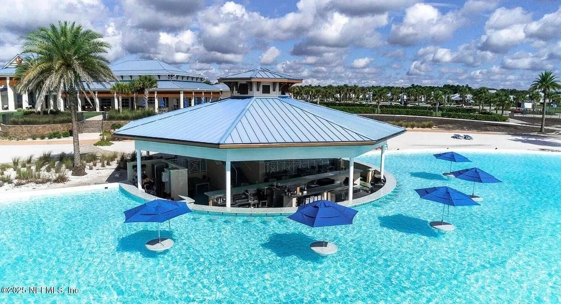 Motivated Seller !! Experience resort-inspired living in Beachwalk's perfectly situated on a spacious corner lot within this gated golf-cart community. This 4 bedroom, 3 bath home offers an open, bright layout designed for easy living and entertaining. A gourmet kitchen equipped with stainless steel appliances and quartz countertops. Primary suite features dual walk-in closets and a luxurious ensuite bath complete with separate his-and-hers showers. Outdoor living features an extended screened lanai with pavers and a private jacuzzi ideal for relaxing or hosting guests. A coated garage floor, paved driveway and a metal roof add convenience and style. The community is steps away from one of the largest man made crystal-clear lagoon in the United States, offering a resort life style with a swim-up bar, clubhouse, fitness center, dog splash park, and miles of walking and golf-cart paths. Minutes away of Daily shop conveniences .