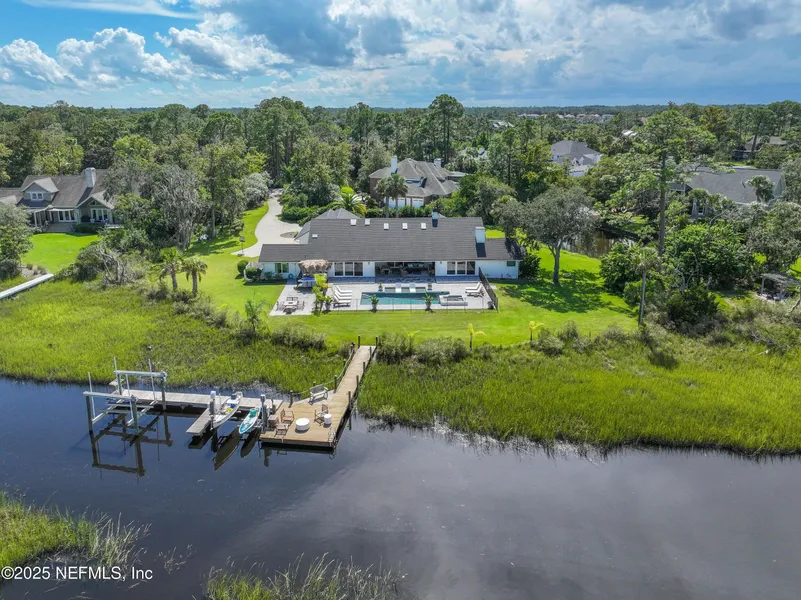 Set within the prestigious Marsh Landing Country Club, this waterfront jewel offers exceptional peace and privacy with breathtaking views of a tidal marsh and direct access to navigable water leading to the Intracoastal Waterway. Boasting 5 bedrooms and 4.5 bathrooms, the home is crafted to deliver both refined luxury and everyday comfort. The gourmet kitchen features custom inset cabinetry and a well-designed butler's pantry, making it a dream space for chefs of all skill levels. Enjoy seamless indoor-outdoor living with sliding doors leading to a large porch with phantom screens that showcase stunning, ever-changing marsh views. Recreational opportunities abound-cool off in the pool, unwind in the hot tub, or launch your boat or jet skis from the private dock, complete with two jet ski lifts and a 10,000-pound boat lift. A spacious 3-car garage adds both convenience and function. Discover the pinnacle of Florida waterfront living-where elegance meets adventure