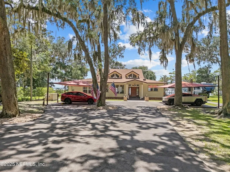Tucked away on nearly 4 private acres & 200ft of deep-water frontage on the St. Johns River, this purpose-built family vacation home offers single-level ease & spectacular river views. The open living space centers on floor-to-ceiling glass that frames the water and invites the outdoors in. A gourmet Thermador-equipped kitchen is adjacent great room, while each of the 4 bedrooms features its own en-suite bath for comfort and privacy. Outside, a paved recreation area invites games, spirited card nights on the covered porches and family laughter echoing across the lawn. By the water, your private dock with 10,000-lb boat lift & dual jet-ski lifts makes boating, fishing, tubing or wakeboarding a daily ritual. Extras include a Generac generator, artesian well with water-softener, dual EV charging, RV hookup, metal roof & durable fiber-cement siding. No HOA, adjoining conservation land, & eas...