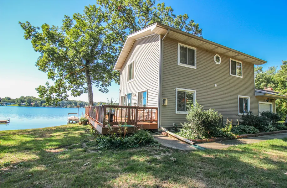 108' FRONTAGE OF SANDY FRONTAGE ON BEAUTIFUL ALL SPORTS PLEASANT LAKE...with panoramic lake setting. The exterior presents a spacious main level deck great for entertaining and composite decking on upper level for relaxing quiet times...soaking in the view. Steel sea wall and 7 section aluminum dock. Updated kitchen with soft close cabinets, quartz countertop and newer appliances. Gas fireplace in living room with bay window offering amazing lake views and natural lightening. Main floor bedroom and full bath with walk in shower and tile flooring .Hardwood flooring featured throughout most of the home. Upper level 15x30 bedroom with vaulted ceilings, spacious walk in closet, and sliders to the deck overlooking the lake. Whirlpool tub and skylight highlight upper bath. 11x20 finished family room in basement with an electric fireplace and glass block windows. Many of the mechanicals are new...