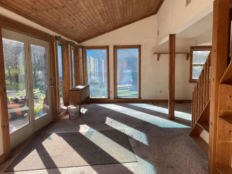 Nestled in a serene wooded setting next to Trout Brook, 312 McIntyre Rd. in Winthrop, NY offers a peaceful retreat on ~5.8 acres of land. Set back from the road, this property features a detached two-car garage with storage above and convenient automatic door openers. Inside, the spacious kitchen opens to a dining area overlooking the brook. The home boasts three distinct living areas: one with built-in bookshelves, a skylight, and access to an enclosed front porch; the second with storage space and a spiral staircase that leads to an upstairs loft/bedroom; the third with a partially vaulted ceiling, knotty pine details, and large floor-to-ceiling windows that flood the room with natural light. Also on the main floor, you'll find a bedroom with a sliding glass door to a private deck overlooking a tranquil brook, as well as a room that is large enough to be a bedroom, second bathroom or laundry room. A spacious full bathroom with a tub completes the main level. The upstairs spaces are accessed by either of the staircases and the rooms are sectioned into two distinct spaces. Up the main staircase is a light-filled space that was used as a sleeping area with two large closets. The other portion of the second floor was also used as a sleeping area and offers a cozy, yet large space. Outside, enjoy the large front and back decks, a workshop, and a covered lean-to for extra storage. This property offers privacy and a natural setting, perfect for those seeking a peaceful escape.