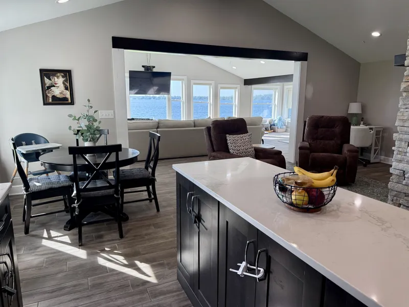 Welcome to this stunningly remodeled home on the St Lawrence River. Step inside where everything is new and modern, bright and fresh. The first thing you will notice is the wall of windows allowing the St Lawrence River into your home. The living room is flooded with light and the open floor plan with the kitchen makes this such an inviting space. The kitchen has quartz counter tops, soft close cabinets and drawers and a large kitchen island that is open to the sitting area around the custom built stacked stone wood burning fireplace. There are three bedrooms with the primary room having a walk in closet. The bathroom has a jetted tub, tiled shower and the laundry is conveniently located here as well. The house has electric in floor radiant heat, propane on demand hot water and a mini split AC unit and all new electrical and plumbing. The house is nearly finished with its remodel- just n...