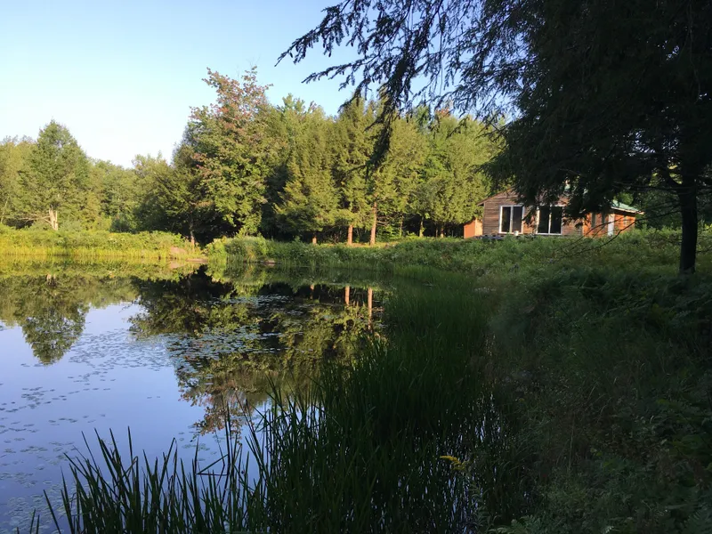 This rustic Hunting Cabin sits way off the road and is accessed by a private driveway. The cabin overlooks a private creek-fed pond and in a beautiful setting with a large yard surrounded by forest.
