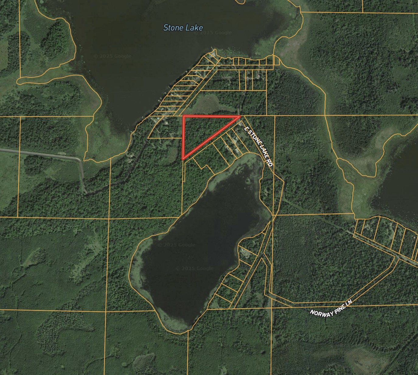 Best access is from the northeast corner along East Stone Lake Road. The dirt road is driveable year-round. Underground electric boxes and overhead power lines are nearby, and neighboring homes likely use well water. Strong cell service throughout the property.