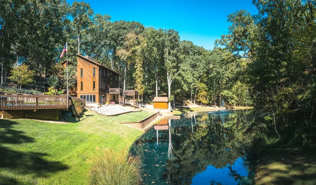 This stunning contemporary home, nestled on 9.57 picturesque acres, offers an exceptional waterfront view of a stocked lake, complete with a beautiful fountain. The lake is well-stocked with bass, bluegill, and catfish, perfect for fishing right at your doorstep. The main home boasts over 5,000 sqft of luxurious living space, designed to accommodate large families with ease. It features 4 spacious bedrooms, 4 baths, and breathtaking lake views from nearly every room. An entertainment room with a full bar offers the perfect setting for hosting guests. The outdoor space is equally impressive, with meticulous landscaping, retaining walls, and a serene park-like setting. There’s also a pool area, ideal for summer fun, and a detached 3-car garage with loft storage. Located within minutes of Fenton and St. Louis, this property offers the best of both worldspeaceful rural living with city conve...