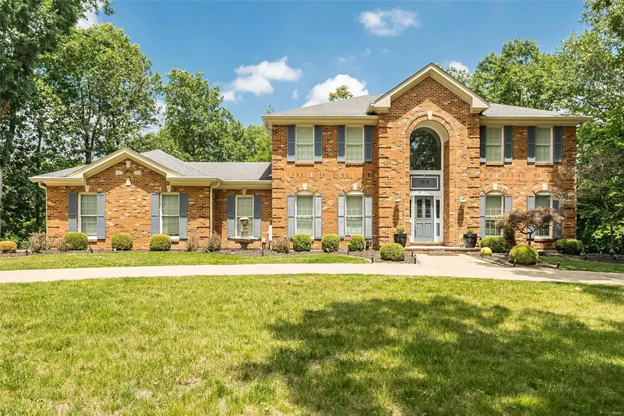 Classic brick 2-sty Colonial on 3-acre grounds. Distinctive design elements & custom amenities including oak hardwoods, detailed trim work & plantation shutters are evident throughout the home. Impressive covered porch entrance leads to 2-sty foyer, study, formal dining room and library-paneled family room with beamed ceiling, wide bay window, wet bar & floor-to-ceiling brick fireplace flanked by built-in bookcases. Vaulted kitchen with granite countertops, premium stainless steel appliances, 6' center island & convenient planning center adjoins light-filled breakfast room with French doors that open to private deck that overlooks wooded ground. Hardwood floors continue to the 2nd level with coffered primary bedroom suite with customized walk-in closet & marble bath with freestanding tub & shower spa plus 3 generous-sized additional bedrooms & hall full bath. Grounds include deck, patio, circular drive & 3-car garage. Award-winning Rockwood School district.