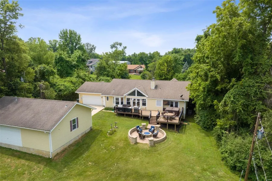 Priced under Appraisal! No HOA! Private 1 acre lot w/lots of nature! 2196 sq ft, 4 BR 3.5 BA. Ranch. 1200 sq ft Detached Building with HVAC and rough in bath, perfect for Small Business Owners or a future mother-in-law quarter! Enter into the open great room with a vaulted ceiling, large Pella windows, solid hardwood floors and cozy gas fp with custom built in cabinets. Solid wood 42" kitchen cabinets, SS appliances, granite countertops and breakfast room. Separate formal dining room currently an office. Main floor laundry. Vaulted primary suite with separate tub/shower, makeup vanity, WIC, and french doors leading to a spacious composite deck w/encased outdoor TV Walk down to a stamped concrete patio w/stone surround and built in gas fire pit, perfect for entertaining. Dual zone HVAC. Partially finished basement with large rec area, custom bar, workout room and full bath. Lg Basement storage. Brick front with smart siding. Attached oversized 2 car garage.
