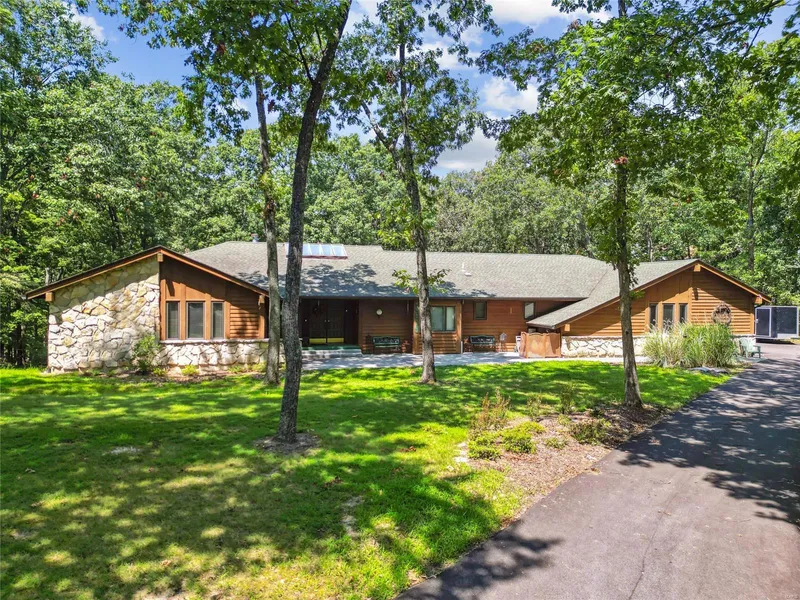 Prestigious Ranch Home has 4+ Beds/5 Baths offers 4042 sq ft living space on private 3.41 acres in highly desired LaSalle Woods in Wildwood. Woodsy setting gives a Colorado/Northern California feel. Circle drive leads to oversz 4 car garage has alcove/hobby area. Dramatic 2 story entry w/skylight, atrium & marble floor opens to large dining rm & spacious great room w/vaulted ceiling & stone FP. Kitchen/breakfast room offers ample cabinet & counter space, center island w/cook top, double wall ovens, SS appl., pantry & desk. Off kitchen is half bath & VERY large main floor laundry rm. Primary bed has vaulted ceilings, private balcony, en suite bath w/jet tub, sep shower & 2 walk-in closets. Second smaller Primary w/full bath ensuite also on main. 2 nice sz beds & hall bath complete main. W/O LL to large patio has family rm, rec area w/FP, 5th bed, office, exercise rm, full bath. Maint. free vinyl 52x17 deck, 26x18 shed & level sitting/play area. Award Winning Rockwood Schools.