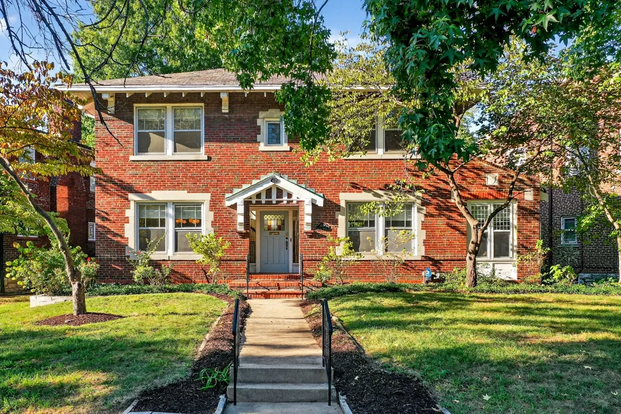 Perfectly positioned at the edge of Clayton, this beautifully maintained 4-bedroom home blends timeless architecture with thoughtful updates—all in one of the city’s most sought-after locations. A spacious center hall floor plan welcomes you with light-filled rooms and an easy, open flow. The generous living room with fireplace opens to a charming three-season cocktail porch—ideal for relaxing or entertaining. The elegant dining room connects seamlessly to the original butler’s pantry and a bright, updated kitchen featuring custom cabinets, stone countertops, and newer appliances. Upstairs, four cheerful bedrooms offer ample closet space, while the stylishly updated full bath boasts classic subway tile and fresh finishes. The newly finished lower level adds flexible living space for a family room, media lounge, or private retreat. Outdoors, enjoy a beautifully landscaped yard with a two-tier deck, classic brick patio, and direct views of a landscaped community green space. An oversized 2-car garage with private alley access adds everyday convenience. With easy access to top schools, Forest Park, DeMun Village, shopping, transit, and major highways, this home offers exceptional charm and unbeatable location.