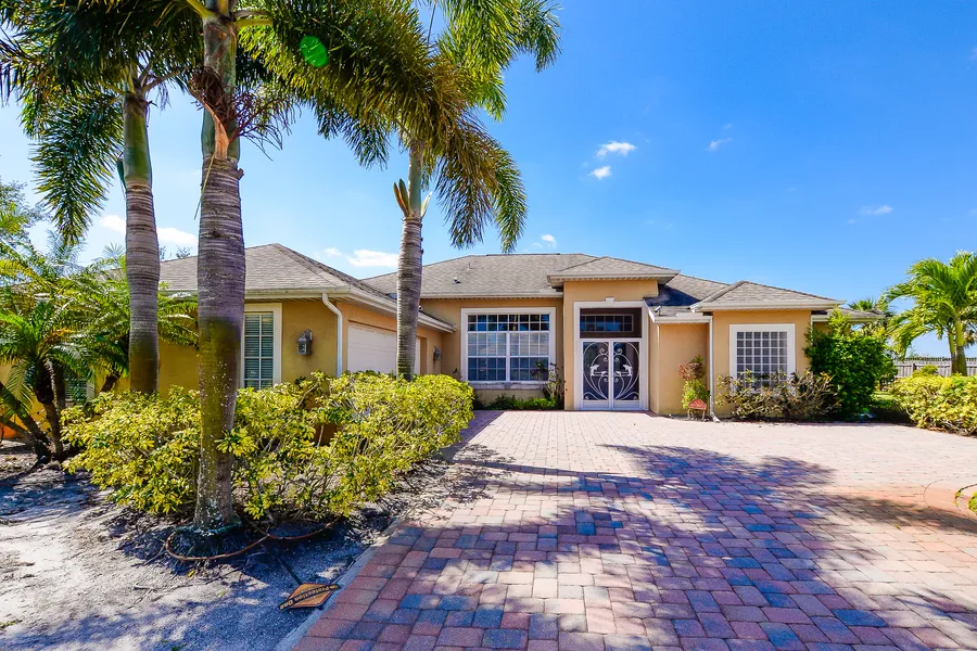 Beautiful 4/2/2 pool home on a half acre on the C-23 canal with dock in a nice quiet neighborhood. Contemporary styling with double entry front doors with glass inserts, screened front entryway, and stately brick paver driveway. Kitchen is appointed with white cabinets and black granite countertops, and a double oven. Tile throughout main areas and the bedrooms are carpeted. Laundry room with sink and cabinetry. Beautiful half acre lot with a berm to the C23 canal with dock. Beautiful property.