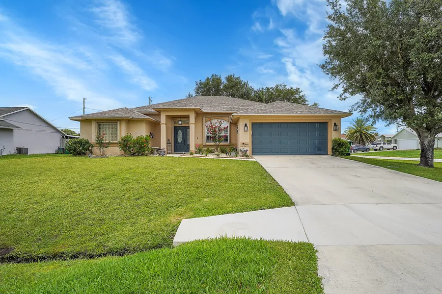 Never lost power! Welcome to your dream home! Nestled on a corner lot, this exquisite 3-bedroom, 2-bath sanctuary boasts a 2021 roof and a charm that sets it apart from the rest. Step inside to discover a spacious layout with vaulted ceilings, where the kitchen seamlessly flows into the family room, perfect for entertaining or simply unwinding. Enjoy the luxury of plantation shutter window treatments and blinds on sliders, offering both style and functionality. Relaxation awaits on the screened patio overlooking your private, shaded fenced back yard, providing a serene retreat for all seasons. Feel secure with newer 2021 accordion storm shutters, a hurricane-rated 2016 garage door, and a 2022 whole house generator with a 500-gallon in-ground propane tank, ensuring peace of mind during any weather. Indulge in modern conveniences with all appliances replaced in 2022, including a front-loading washer and dryer, and a 2017 A/C unit with a Hepa filter, recently serviced and fully charged. Stay refreshed with a 2023 new water heater and a reverse osmosis water filter system in the kitchen, adding an extra layer of comfort to your daily routine. For the storage enthusiast, delight in two walk-in master bedroom closets and two kitchen pantries, providing ample space for all your needs. Additionally, a sprinkler system connected to an in-ground well ensures easy maintenance for your lush landscaping. Conveniently located near Becker Road, I-95, and the Turnpike, this home offers easy access to all the amenities you desire while maintaining a tranquil residential setting. Don't miss the opportunity to make this unique gem yours - schedule your showing today and experience the epitome of Florida living!