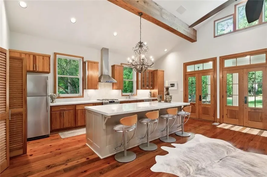 Escape to your serene sanctuary on 8.5 acres of natural beauty along the Little Bogue Falaya River. Originally a 670 sq ft cottage, this home underwent a major expansion in 2011 (added 724 sqft) with designs from Renowned Covington Architect, Randy Aultman, adding a spacious Great Room/kitchen, fireplace, huge screened-in back porch, an extended front porch, and beautiful bathroom with shower. Now offering 1,394 sqft of rustic elegance. The home features heart pine flooring, antique cypress French doors and transoms, and custom birch exposed rafter tails. Soaring cathedral ceilings with Dirty Top Pine beams and energy-efficient Marvin windows flood the open-concept space with natural light. Cozy up by one of the two fireplaces one wood-burning, the other natural gas for a warm, inviting atmosphere. Great for relaxation and entertainment, this home is wired for security and features a great sound system with vanishing speakers in interior/outside speakers for both porches, setting the perfect ambiance. Both porches feature tongue and groove ceilings and floors, with the screened-in back porch wonderful for year-round enjoyment. Eco-friendly features include a green geothermal system for heating and cooling and a 17 kW Generac generator for backup power. For those seeking room to grow, architectural plans are available to expand the home into a 3-bedroom, 3-bath sanctuary with a luxurious primary suite. The property also includes a custom architecturally designed barn, built with the same high-quality materials as the home, offering endless possibilities for hobbyists or storage. The Creek Room, a small screened-in building with electric and water, is ready for converting into a guest room, studio, or peaceful retreat. Certified as a Wildlife Habitat, the property provides stunning natural scenery, river access, and thriving wildlife, creating a perfect retreat for nature enthusiasts. Located just 5 minutes from downtown Covington and 45 minutes to Metairie and New Orleans, this unique property offers tranquil seclusion and convenient access to city amenities. Tractor, furniture, artwork, and mirrors in bathroom are not included.