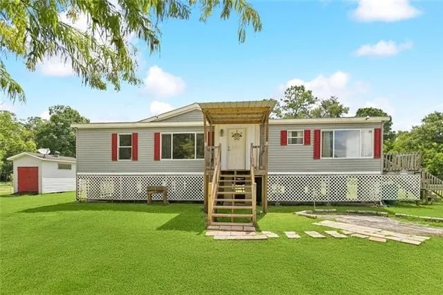 3 BEDROOM/2 BATH RAISED MOBILE HOME LOCATED ON BEAUTIFUL 1.5 ACRE CORNER LOT; ROOF ONLY 3 YEARS OLD; COVERED FRONT DECK AND SIDE DECK FOR GRILLING OUT; PRIMARY BEDROOM HAS WALK-IN CLOSET, AND LARGE BATH WITH JETTED TUB & SEPARATE SHOWER; LARGE WALK-IN CLOSETS IN ALL BEDROOMS; KITCHEN HAS LOTS OF CABINETS, DISHWASHER, RANGE/OVEN & REFRIGERATOR; LARGE PICTURE WINDOW AND SLIDING GLASS DOOR TO PORCH IN DINING AREA; LARGE UTILITY ROOM WITH OUTSIDE ACCESS; BEAUTIFUL MATURE OAK TREES, EQUIPMENT SHED, DOG RUN, AND ADDITIONAL STORAGE IN WELL HOUSE;