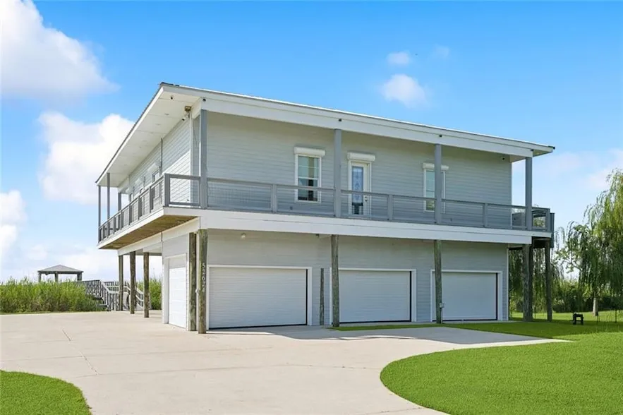 Sportsman's Paradise awaits on the desirable Goehagen Canal, providing a tranquil setting for this waterfront home. Enter your serene oasis through the electric-gated yard, which features a secure gate at the end of the driveway offering ample parking for vehicles, boats, or RVs. The workshop, equipped with four commercial-grade roll-up doors and a double garage door, serves as an excellent workspace or additional entertainment area. An elevator provides convenient access to the home, leading into a spacious laundry area with plenty of storage, designed for large kitchen appliances and bulk items. The living area features breathtaking views through a wall of windows, creating a picturesque atmosphere. The kitchen is a chef s dream, boasting extensive countertop workspace, wood cabinets, a large center island, and a beverage area. Awaken to dreamlike views from the primary bedroom, which has direct access to a large patio ideal for enjoying your morning coffee. The primary bathroom includes a walk-in shower, a large tub, ample vanity space, and a walk-in closet. The two additional guest rooms each come with attached bathrooms, offering guests their own private, resort-like space. Step outside to the main attraction: a back porch with stunning views of the waterway, unobstructed as far as the eye can see. The sunset over Lake Pontchartrain is a sight that never gets old. A stroll down the pier is like a nature walk in itself, leading to a large dock equipped with electricity, water, fish cleaning station, fishing lights, a boat lift, and plenty of entertainment space. Bring your fishing poles and crab traps to enjoy all that the lake has to offer. For added peace of mind, this home includes a whole-home generator, a standing seam metal roof, roll-down hurricane shutters, and has been thoughtfully elevated. Every detail has been considered in this exceptional property.