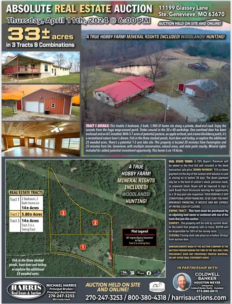 Property Auction upcoming at 11199 Glassey Lane in scenic Ste. Genevieve County. This /-2000 SF home sits along a private, dead-end road. Enjoy the sunsets from the huge wrap-around porch. Tinker around in the 30 x 40 workshop. One overhead door has been enclosed and an A/C installed. A total of /- 33 acres. With 5-7 acres of potential pasture, an apple orchard, and a tame blackberry patch, it's a recreational nature lover's dream. Fish in the three stocked ponds, hunt deer and turkey on the additional 25 wooded acres. There's a potential 1 acre lake site. This property is located 20 minutes from Farmington and 25 minutes from Ste. Genevieve. Multiple conservation, natural areas, and state parks nearby. Mineral rights included. Co-Listed with Harris Real Estate & Auction Auction by Harris Real estate & Auction, Michael Harris - Auctioneer April 11, 6pm onsite. 10% buyers premium added to final bid and inc. in purchase price. 15% down day of auction with cash balance in 30 days.