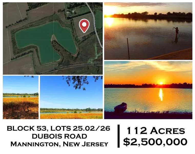 Come see this beautiful property in picturesque Mannington Township, NJ. Comprised of a roughly 45 acre lake surrounded by farm fields, this property is close to one of a kind. A buyer will be afforded the opportunity to boat, jet ski, kayak, fish, swim, hunt and farm all on site. There are no shortages of beautiful sunrises and sunsets and a variety of wildlife abounds in this little slice of paradise. The fishing is awesome and the pond offers a variety of fresh water fish. In terms of hunting, one will find deer, ducks, geese, rabbits, and turkeys. The pond water is largely clear blue; theres a sandy bottom all the way around, and a large sandy beach peninsula is there for sunbathing and relaxing. The lake is spring fed with a long gradual slope before hitting deeper water, and the land surrounding the lake is elevated offering great views and an excellent opportunity for a house or h...