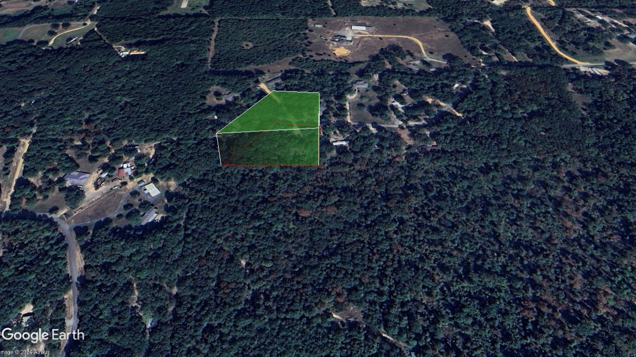 A dirt entryway, partially hidden by leaf cover, leads to a flat area near the dish pole. This spot could easily accommodate a temporary RV use during construction or serve as a potential building site. The rest of the property slopes, which may require preparation for larger structures.