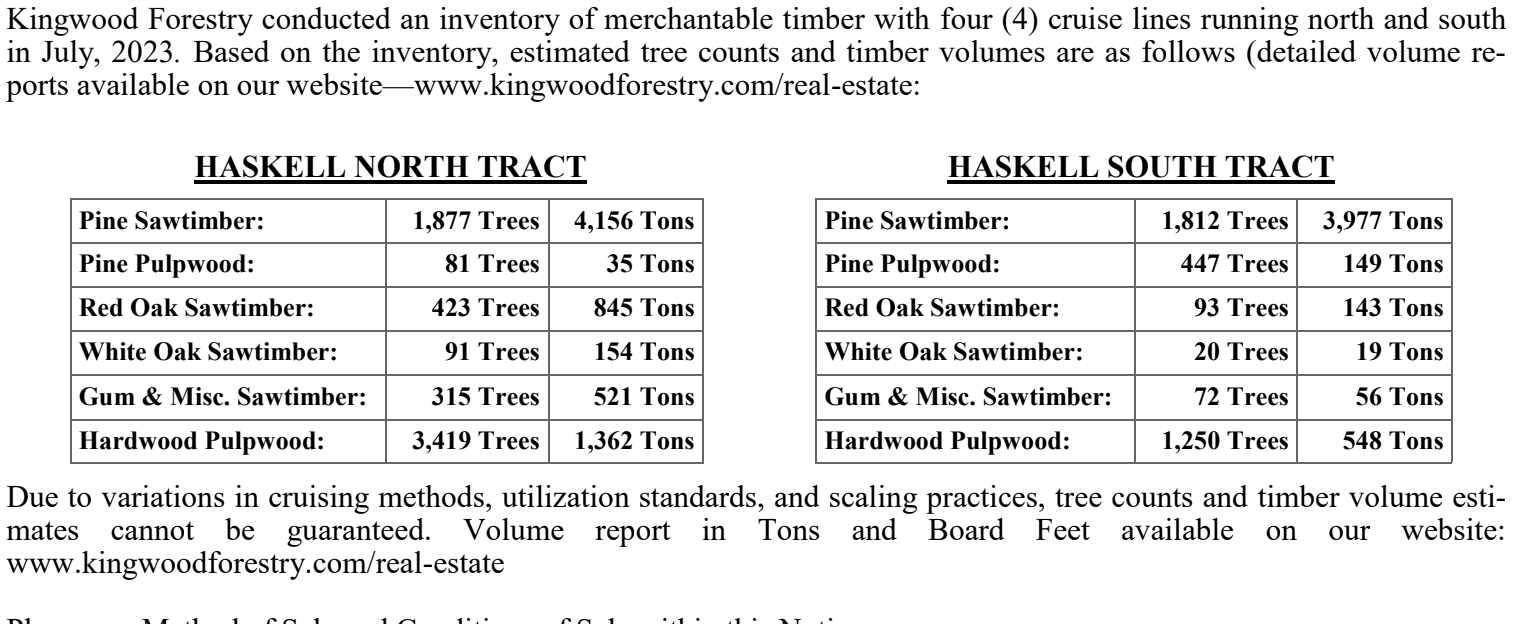 The Haskell South Tract mirrors the same excellent qualities of the North, with a similar timber composition that includes mature pine saw timber, pine pulpwood, red and white oak saw timber, and mixed hardwoods. With a full timber cruise conducted in mid-2023, this tract is ready for anyone looking to capitalize on its timber value. The presence of saw-quality oak means that this land has great returns in the logging world, offering an exceptional opportunity for those looking to invest and be able to enjoy that investment as values continue to rise.