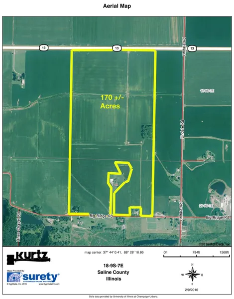 170 +/- acre tract located on IL-13 just 3.5 east of Harrisburg in Saline County. This tract has approximately 163+/- acres of tillable ground and has plenty of access with over 1,900 of frontage on on IL-13 and 1,250 of frontage on Big Ridge Rd. The predominant soil types are Darwin Silty Clay, Harco Silt Loam, and Zipp Silty Clay.