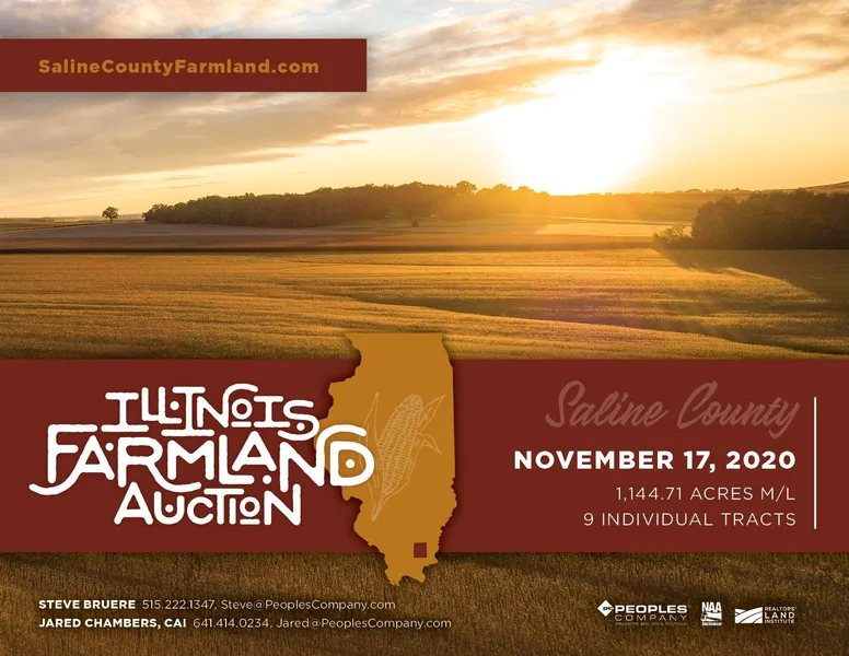 Peoples Company is proud to offer 1,144.71 acres m/l of highly tillable farmland in Saline County, Illinois. The auction will be held at the George Hart American Legion Hall at 10:00 AM on Tuesday, November 17th. The property will be sold in nine individual tracts ranging from 40 acres m/l to 260 acres m/l. These highly tillable tracts contain an estimated 1,108.92 FSA Cropland Acres with highly productive soil types including Harco Silt Loam and Patton Silty Clay Loam. These farms have been operated and well managed by the same tenant for over 30 years with tremendous yields achieved from these farms. Several competing grain marketing options are located nearby including ADM Grain, Gavilon Grain LLC, and Consolidated Grain and Barge Company nestled in the shadows of the Shawnee National Forest, these highly productive tracts are located near Harrisburg and Eldorado, Illinois.
