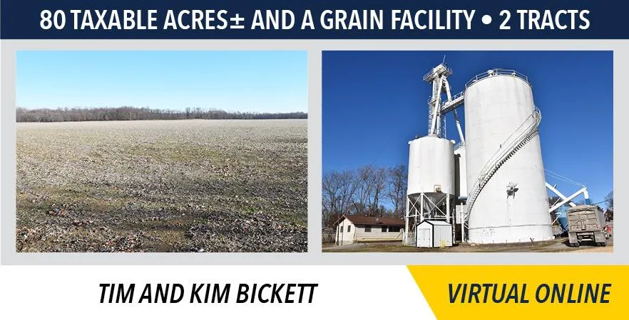 Tract 1 contains a total of 80 taxable acres with 68 productive tillable acres. Tract 2 is a 67,600-bushel grain facility.